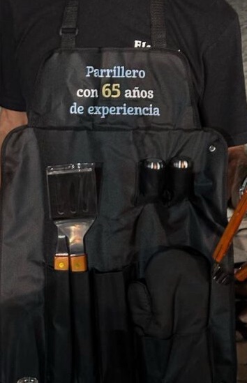 Le regalamos entre todos a Dani un gorro y un delantal bordado con los colores de la bandera de Argentina 🇦🇷 con su nombre y con el texto «Parrillero con 65 años de experiencia». Además en los bolsillos lleva unas pinzas y otros utensilios para que sea un buen “parrillero”.
